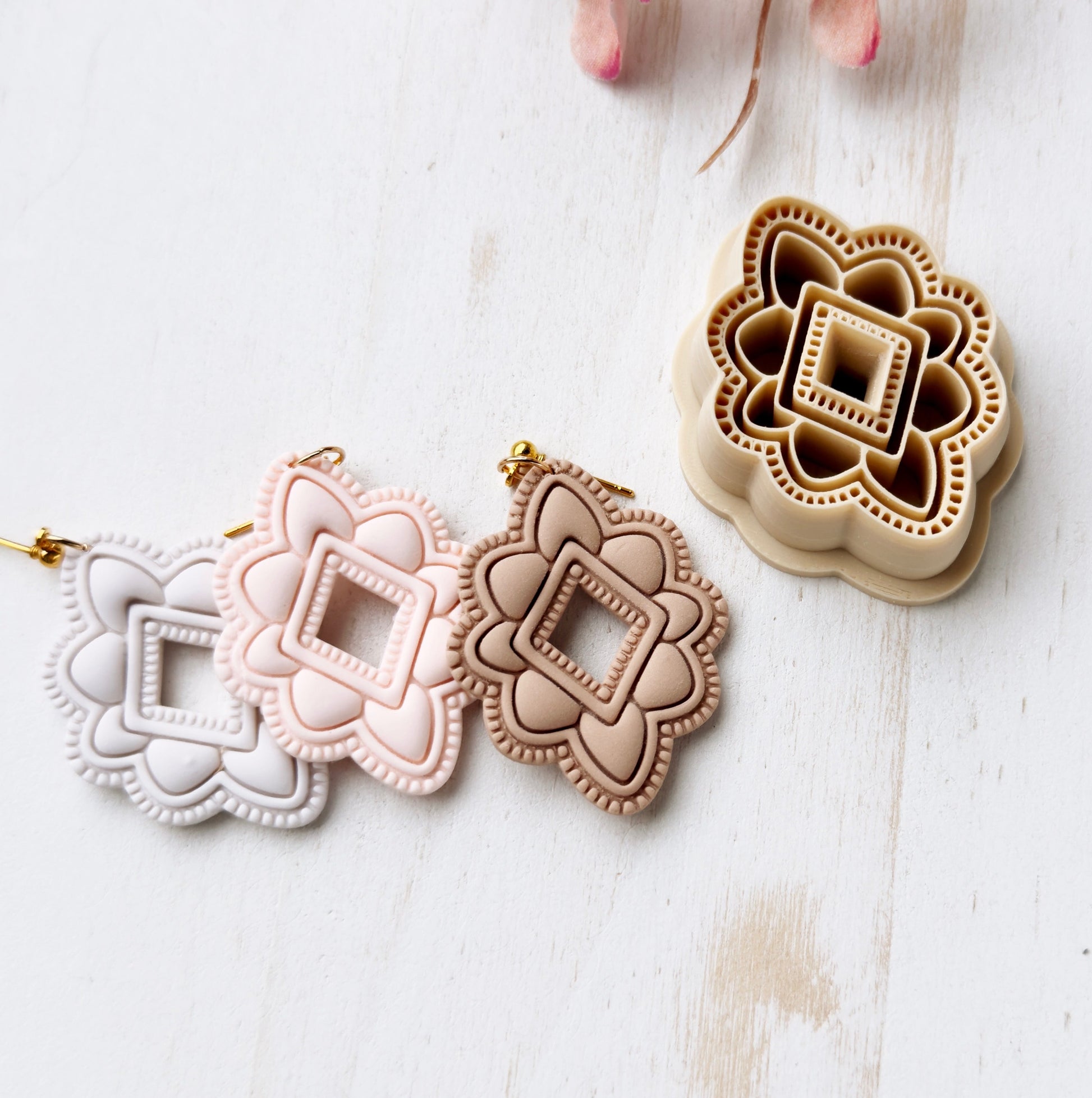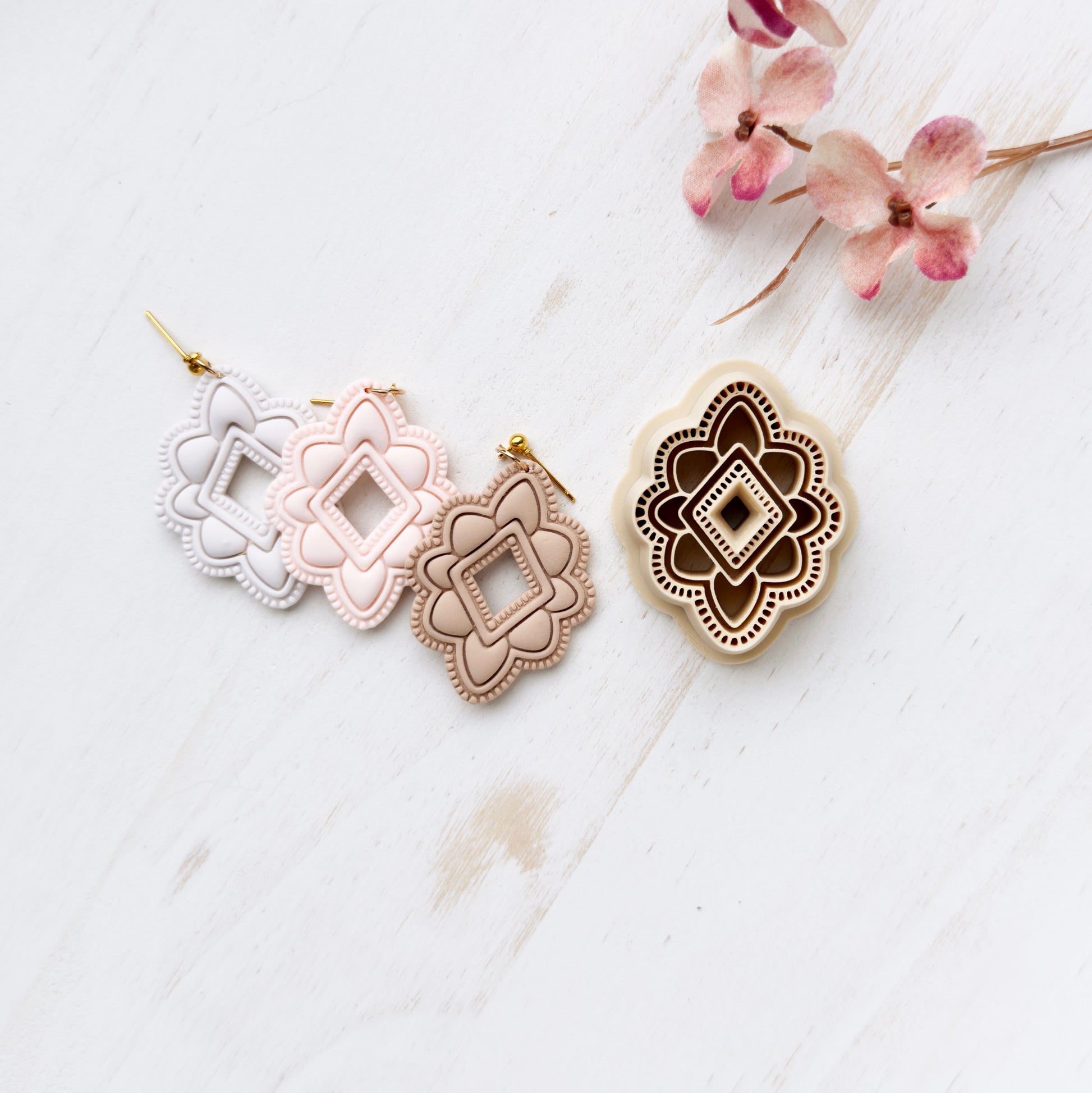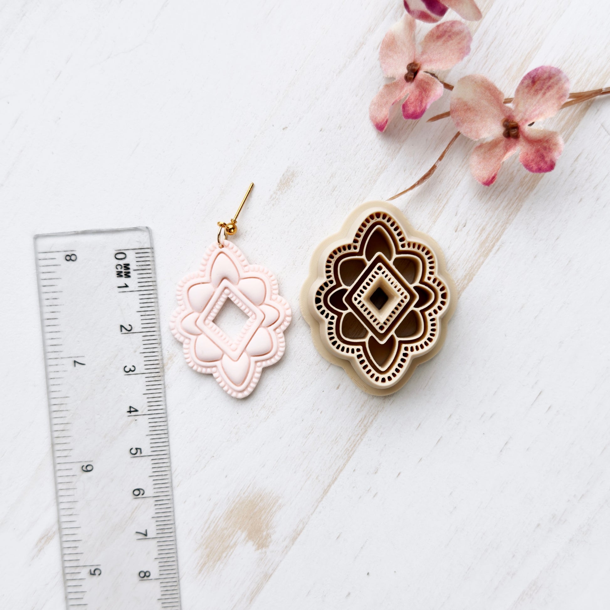 Gently press into clay, slightly wiggle the cutter and lift to remove. Edges can be smoothed with your fingertips or sanded after baking. I recommend sanding for the cleanest finish. Corn starch is a great way to help from clay sticking to your cutter, especially a cutter with small details. Working on a glass sheet or tile is recommended to keep the clay from sticking to your cutter, also.