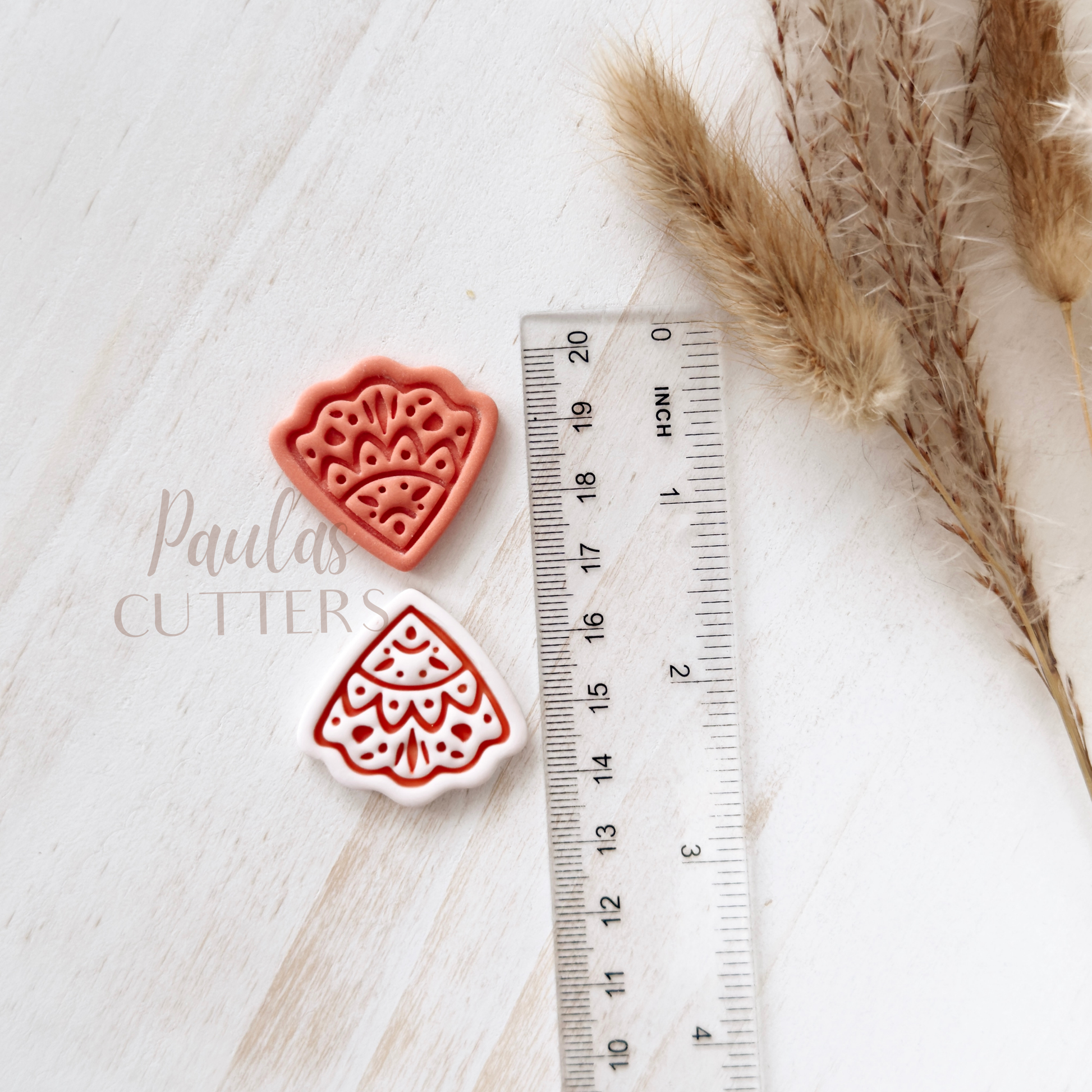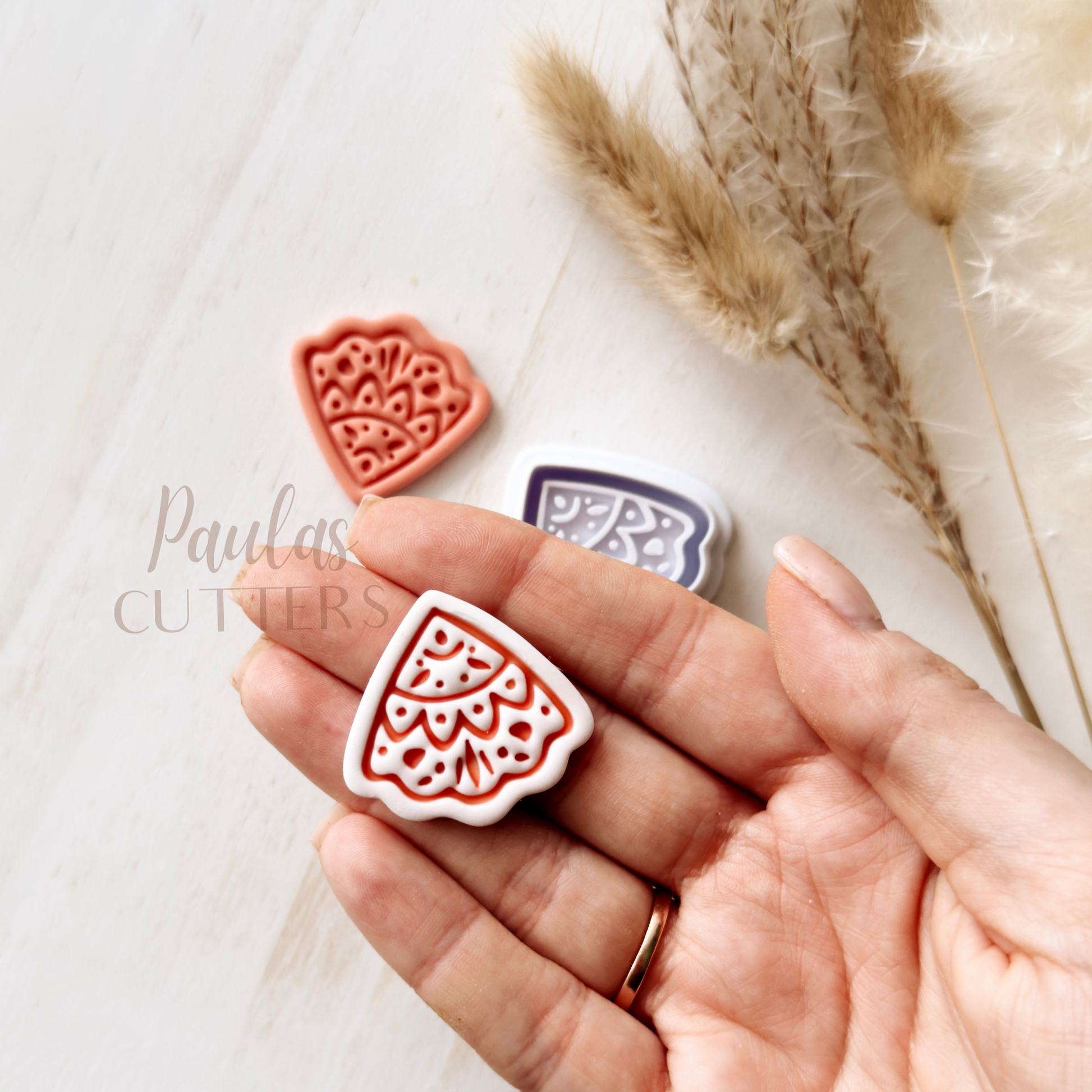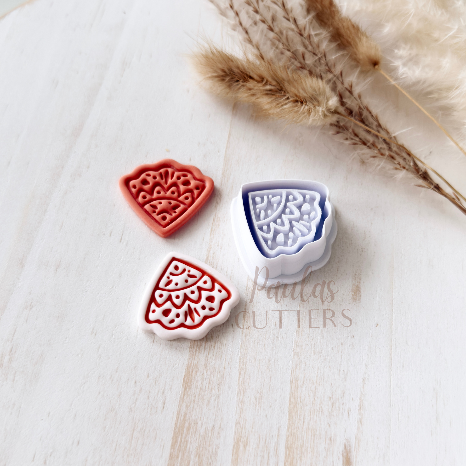Gently press into clay, slightly wiggle the cutter and lift to remove. Edges can be smoothed with your fingertips or sanded after baking. I recommend sanding for the cleanest finish. Corn starch is a great way to help from clay sticking to your cutter, especially a cutter with small details. Working on a glass sheet or tile is recommended to keep the clay from sticking to your cutter, also.