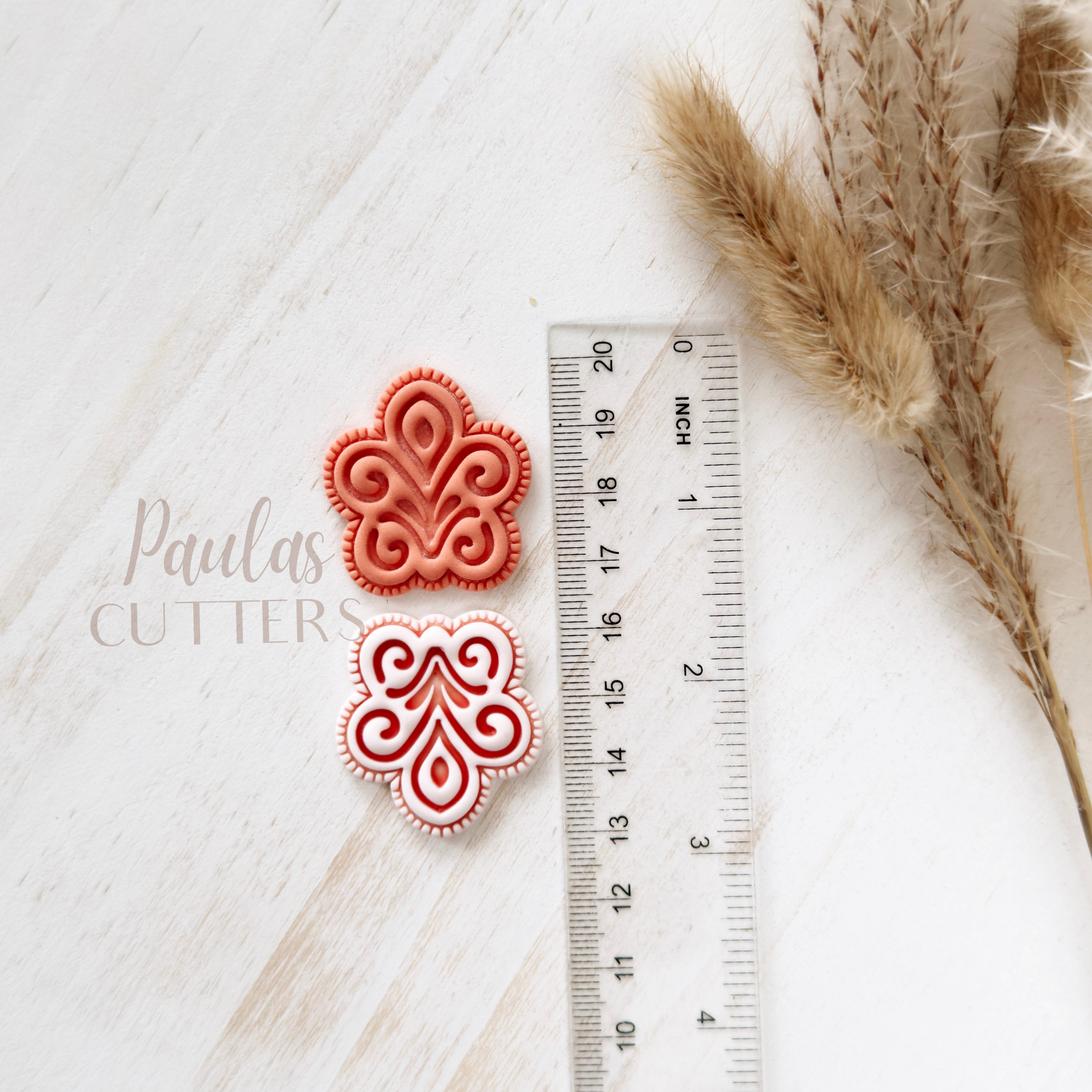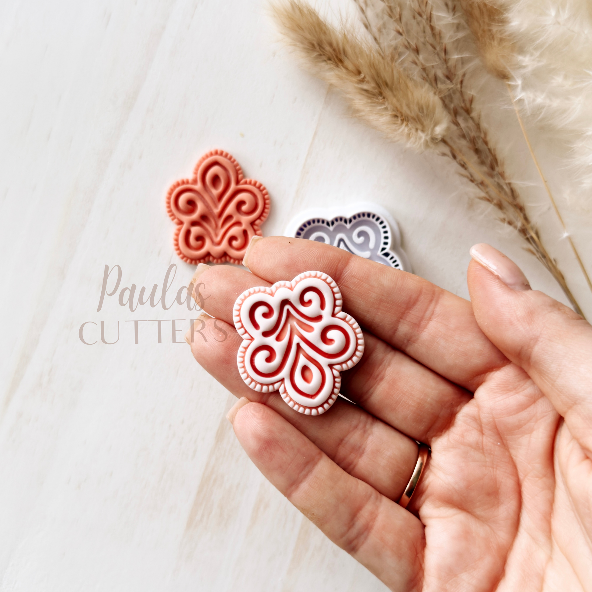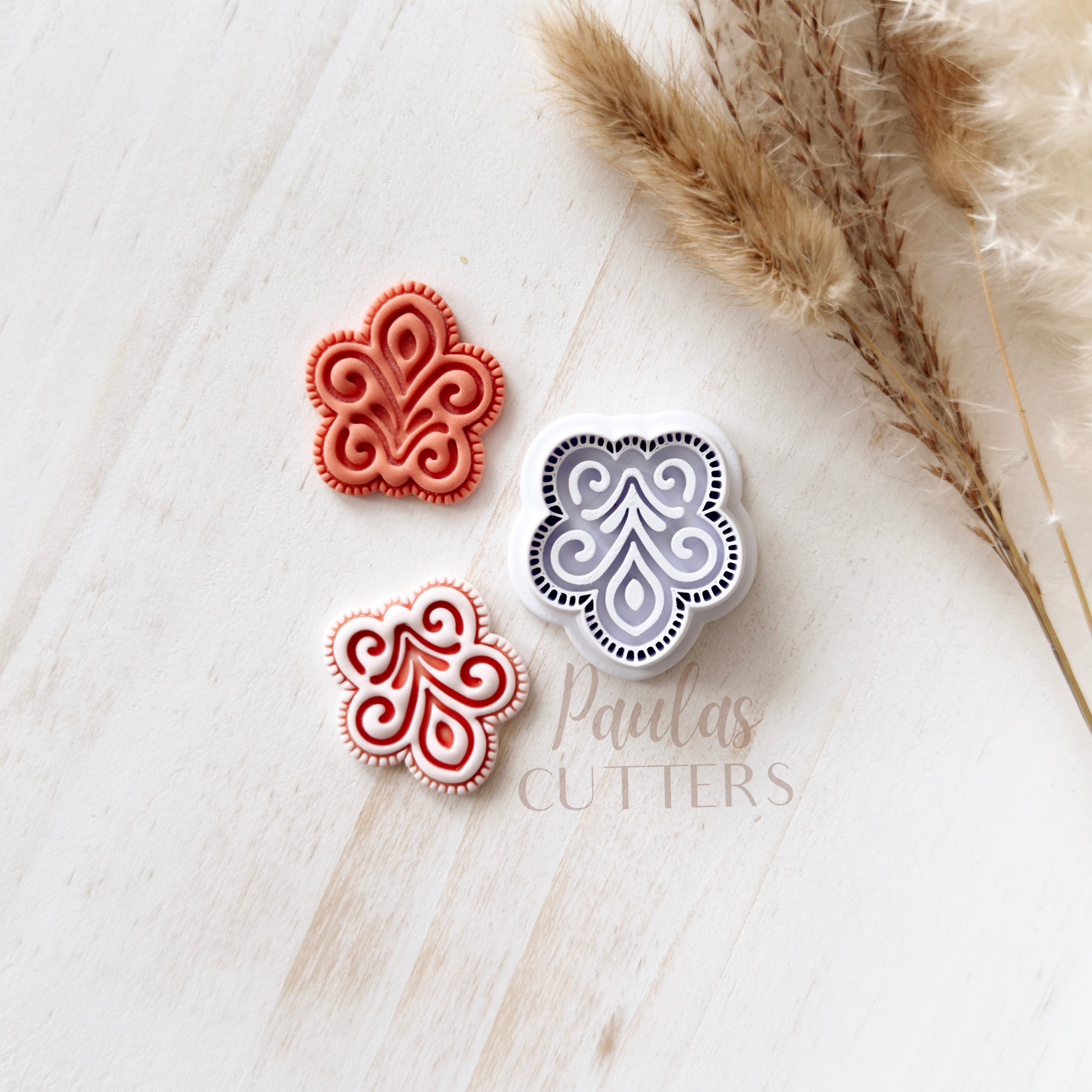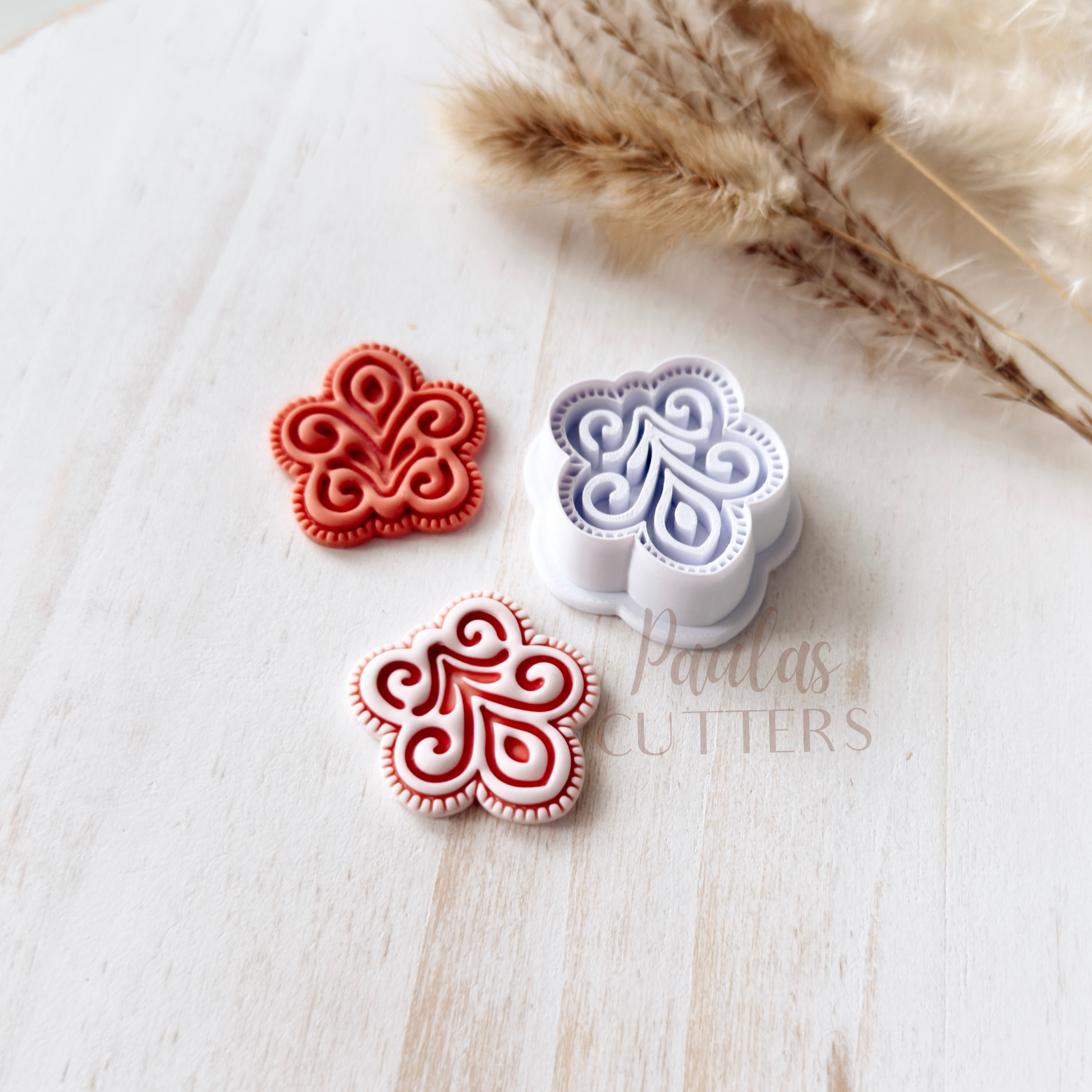 Gently press into clay, slightly wiggle the cutter and lift to remove. Edges can be smoothed with your fingertips or sanded after baking. I recommend sanding for the cleanest finish. Corn starch is a great way to help from clay sticking to your cutter, especially a cutter with small details. Working on a glass sheet or tile is recommended to keep the clay from sticking to your cutter, also.